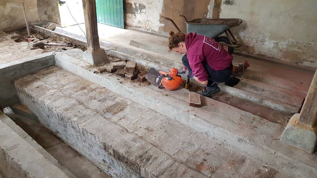Unten im Eingangsbereich wollen wir Klinker pflastern. Also muss der Stallboden raus. Jan lud sich ein paar Freunde für das Gröbste ein und los ging es. Der Schlaghammer war wirklich Gold wert. Dabei wurde Schubkarrenweise der Schutt rausgefahren.