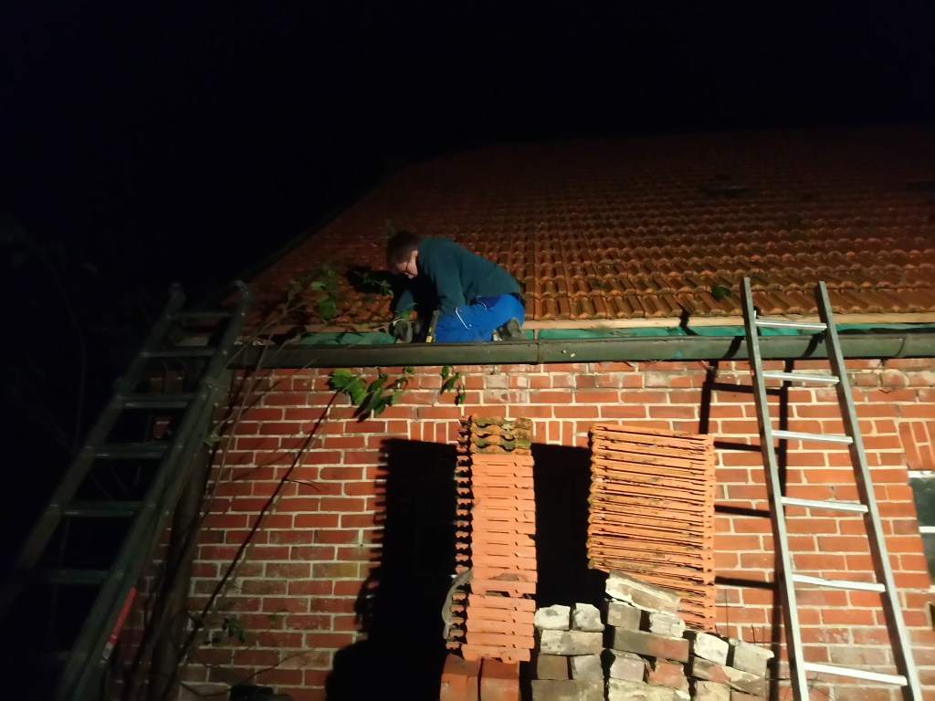 Zuvor zog Jan noch die Unterspannbahn zwischen die Balken. Unten kam ein Stück Teichfolie entlang, damit, wenn es Regnet, das Wasser auch wirklich in der Dachgosse landet und nicht an unser Innenwand runterläuft.