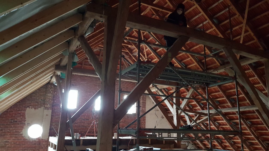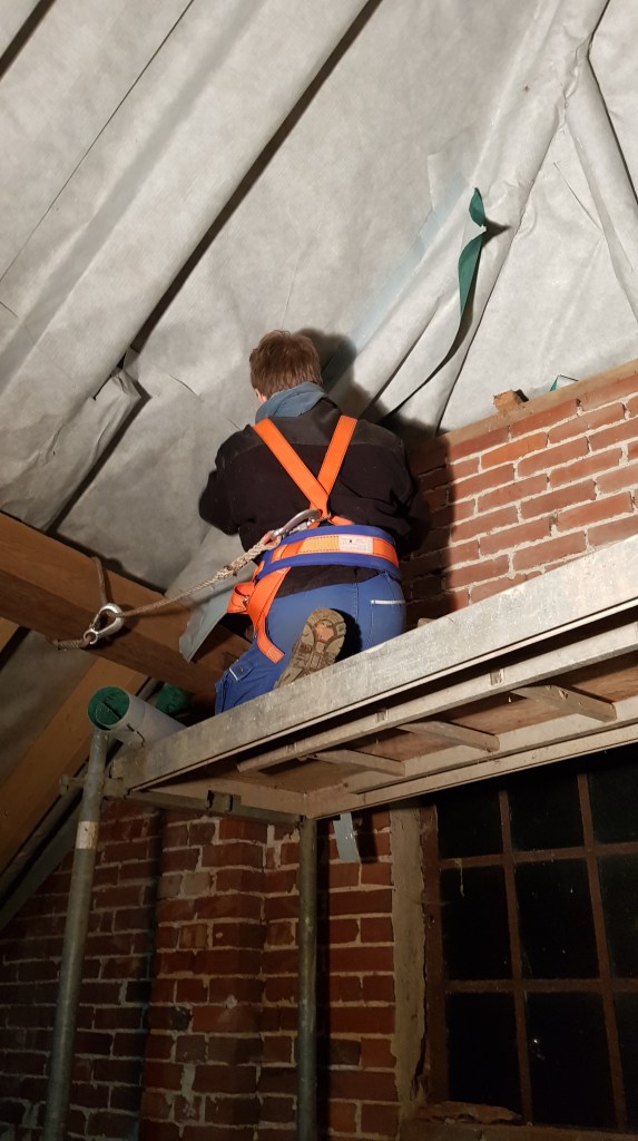 Parallel zum einziehen der Unterspannbahn mussten auch alle Balken gereinigt, geschliffen und geölt werden. Das war mühselig. Mit im Einsatz hier Leinöl, Tücher, Schwingschleifer, Bandschleifer und der Exzenterschleifer!