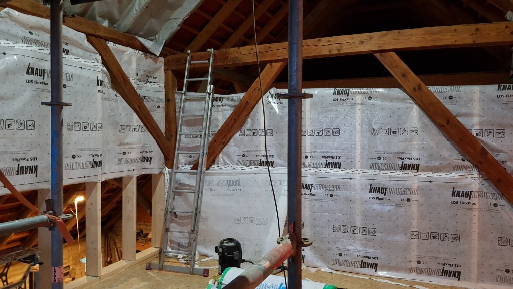 Messen, Sägen, Messen, Sägen… und die Dampfbremse davor tackern. hier im Bild sehen wir schon unsere zukünftigen Sichtbalken vom Wohnzimmer.
