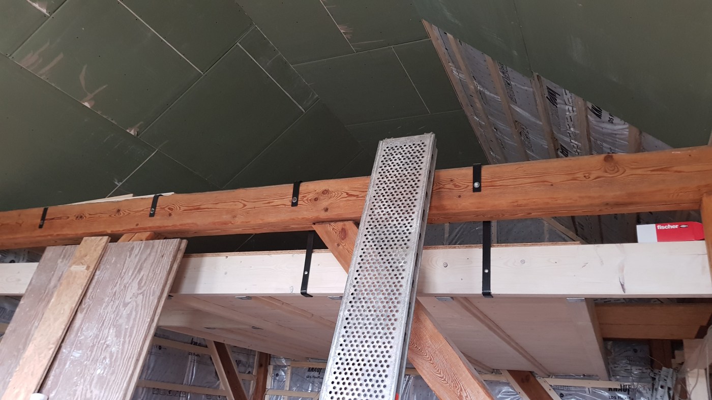 Wir (Jan, Jan und Ich – Kati) haben den Rigips angeschraubt. Rechts, wo die Konterlattung zu sehen ist kommt noch ein Dachfenster rein! Bald geht es hier an das verspachteln und danach können wir schon die Wand streichen.