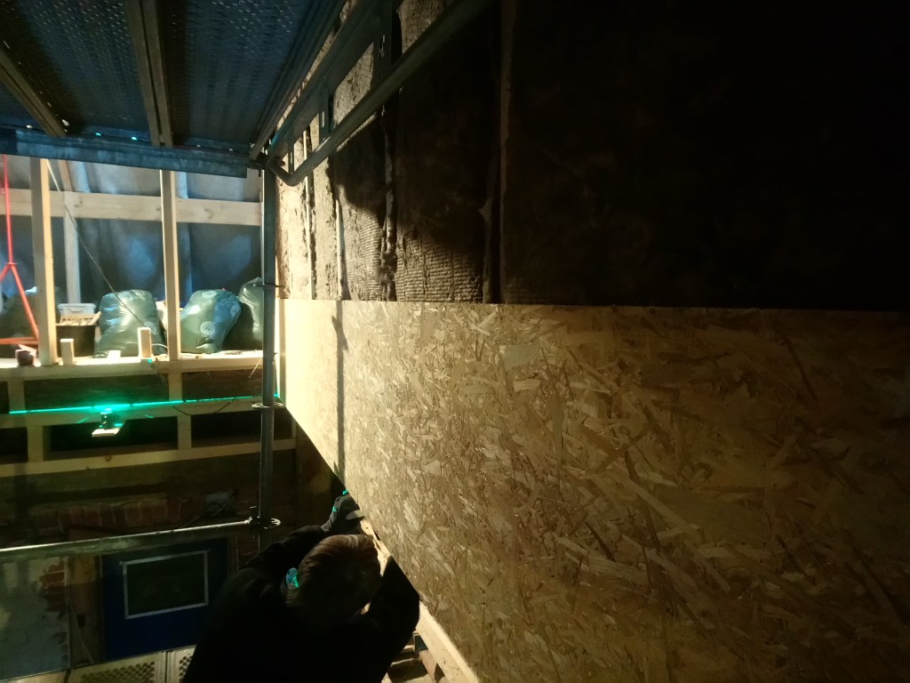 Drei Tage haben wir die Außenwand verkleidet. 6 Meter hoch stehen wir an der höchsten Stelle des Gerüstes.
