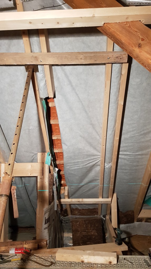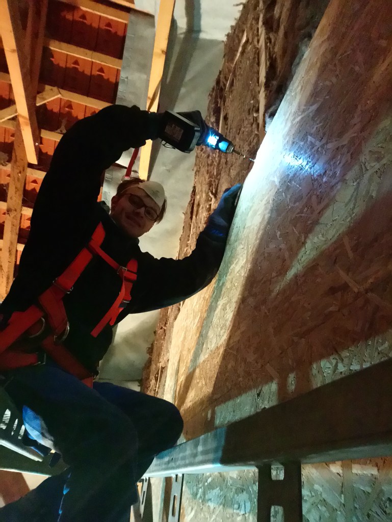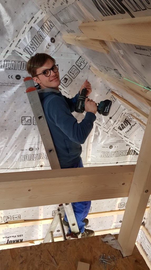 Der Blick von unten. Am nächsten Tag hat uns dann nochmal der andere Jan geholfen. Er hat unten die OSB Platten gesägt und wir haben sie oben angeschraubt. Das gleiche dann auch noch für die Badezimmerwand!