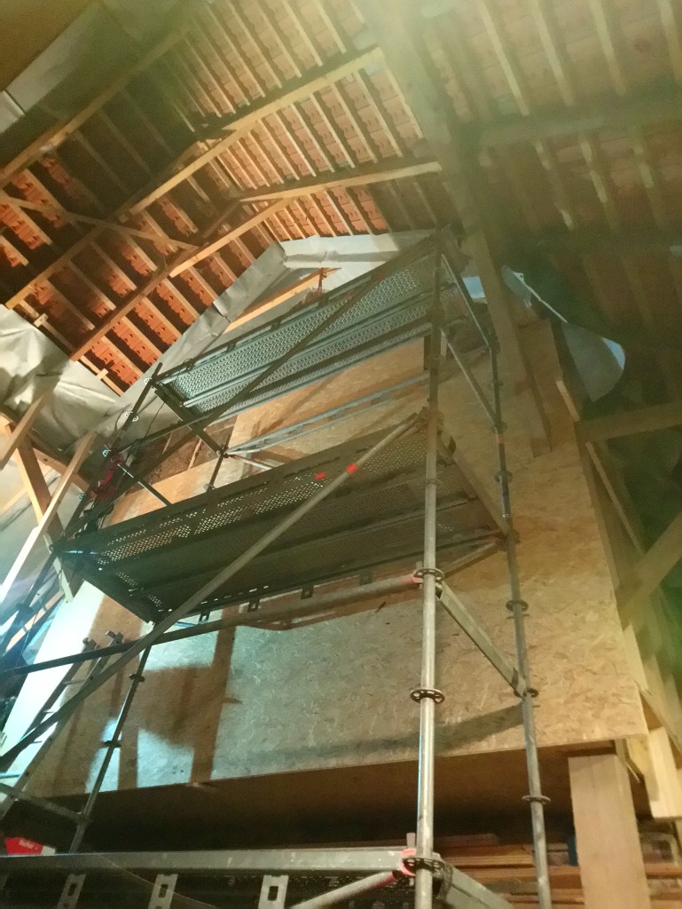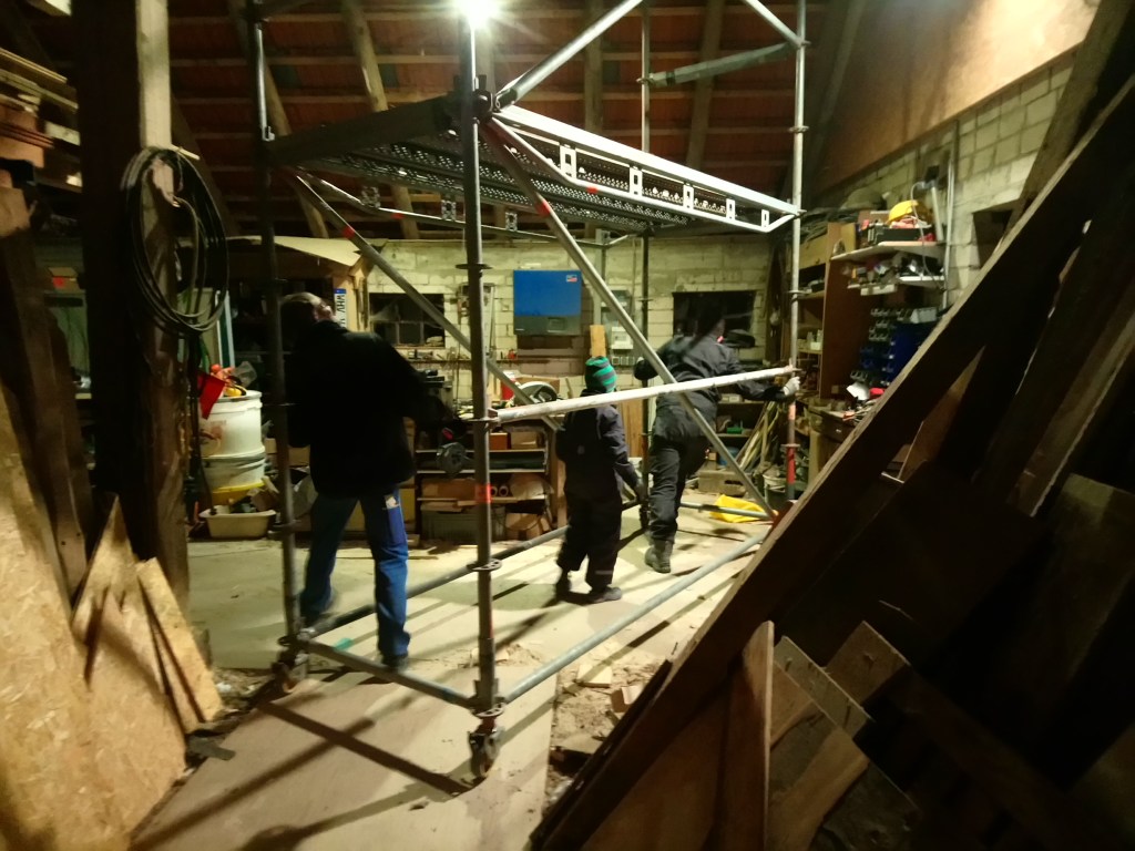 Jan war davon überzeugt, dass wir das Gerüst um eine Ecke schieben können. Davon waren wir ganz und gar nicht überzeugt. Aber wir versuchten es trotzdem. OK, nicht mit der vollen 6 höhe des Gerüstes, wir bauten die oberste Etage ab…