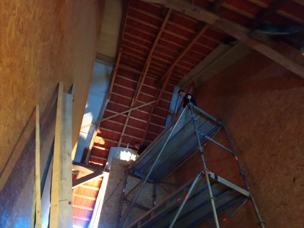 Das Gerüst haben wir nun auf 6 Meter Höhe verlängert. Nun sind wir hoch genug um die Außenwände zu Isolieren!