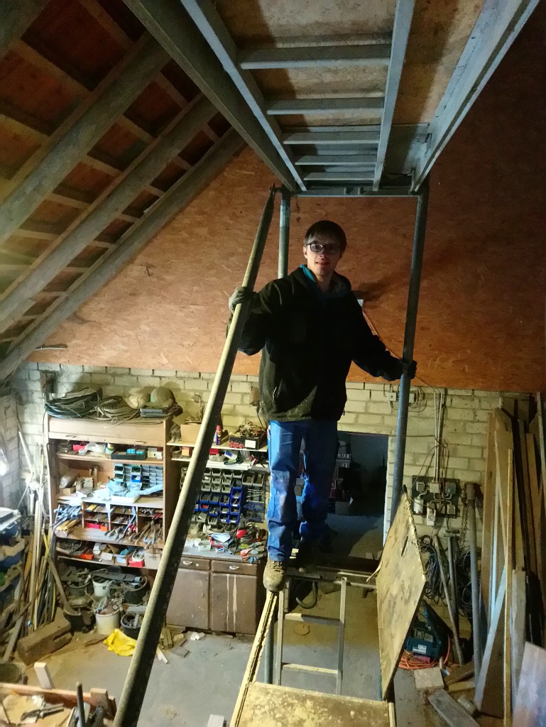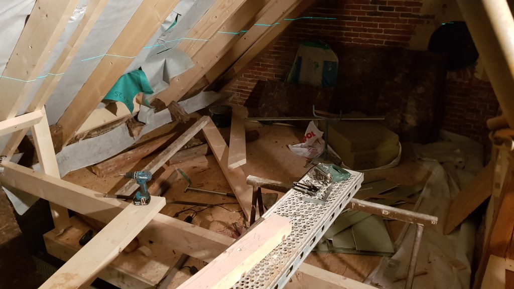 Zwar sehr knapp, aber wir haben es in die Dachschräge reingepuzzelt und können nun gut Arbeiten. Am Ende hat es doch gepasst und wir mussten es nicht abbauen!