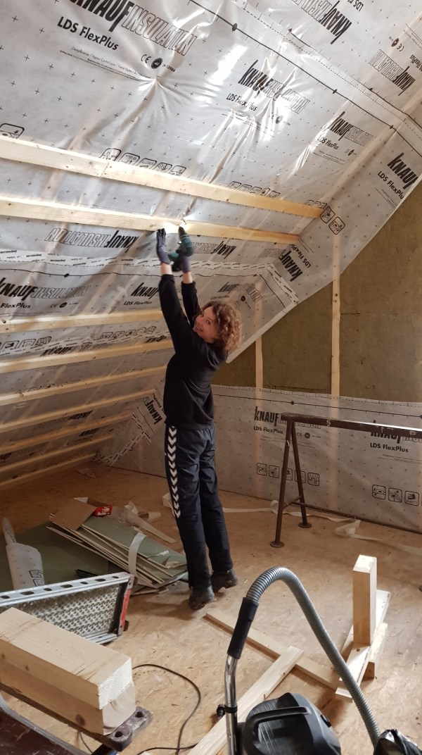 Wir (Jan, Jan und Ich – Kati) haben den Rigips angeschraubt. Rechts, wo die Konterlattung zu sehen ist kommt noch ein Dachfenster rein! Bald geht es hier an das verspachteln und danach können wir schon die Wand streichen.