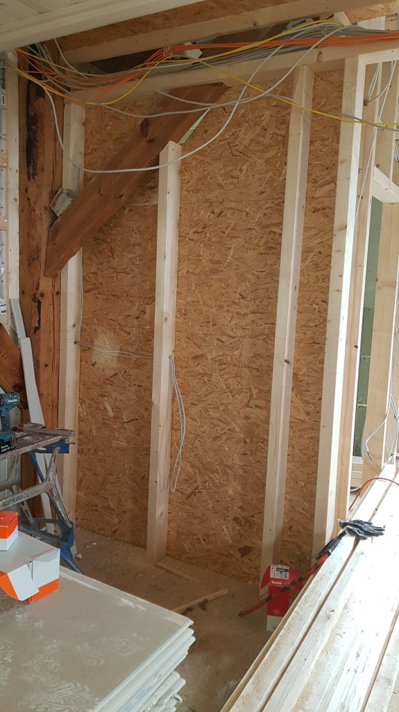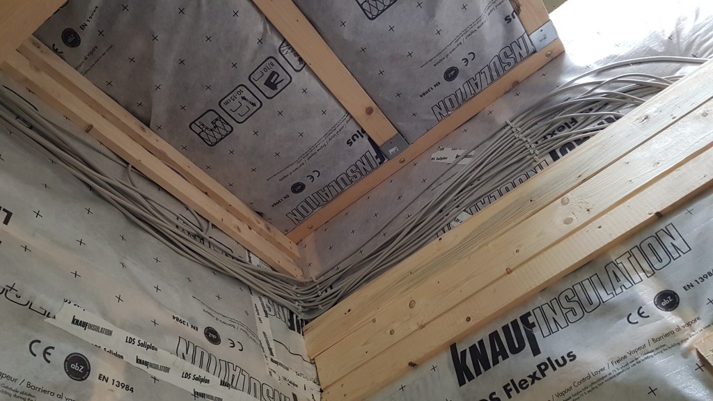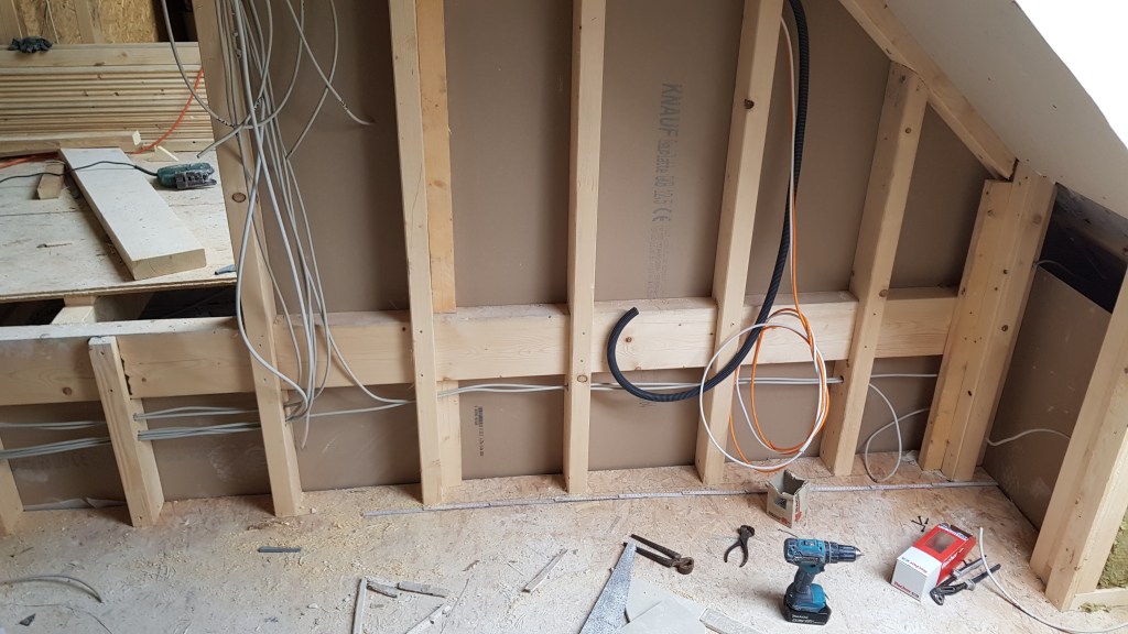 Die Kabel laufen schließlich alle zum Sicherungskasten. Dieser ist noch nicht angebaut. Dafür muss erst die Wand fertig.
