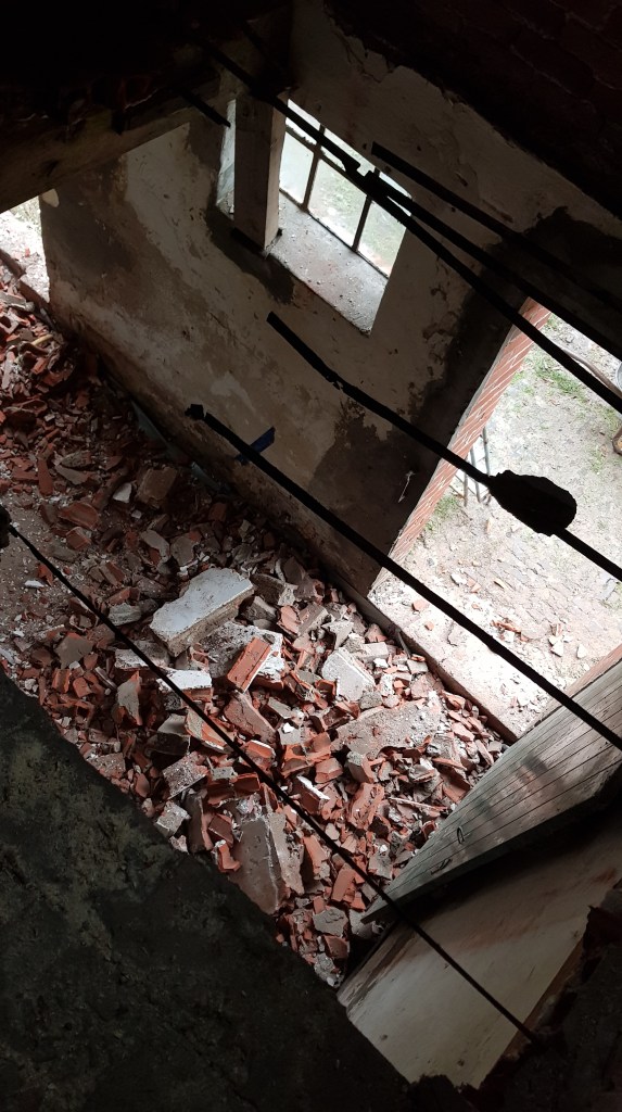 Die Decke ist aus Holziegeln. Also mussten wir Löcher in die Holziegel machen und neuen Beton drüber gießen. Durch die Löcher in den Holziegeln füllten sich auch diese mit Beton und es wurde ein guter, fester Boden/Decke. Jetzt hält es. Zur Stabilisierung haben wir noch vorher Moniereisen dazwischen gelegt.