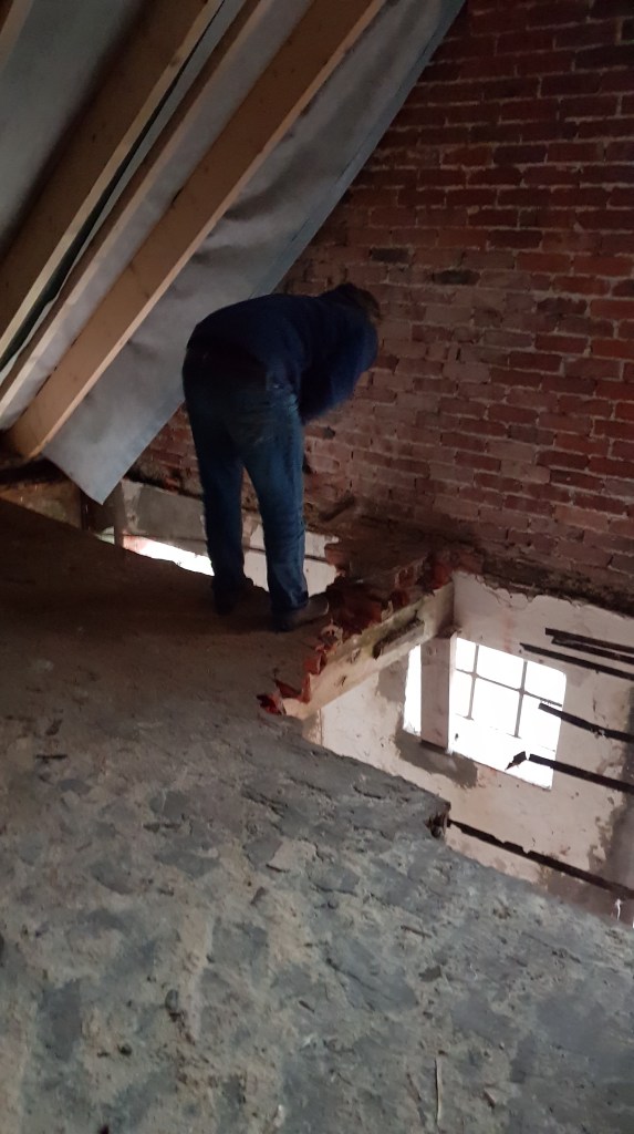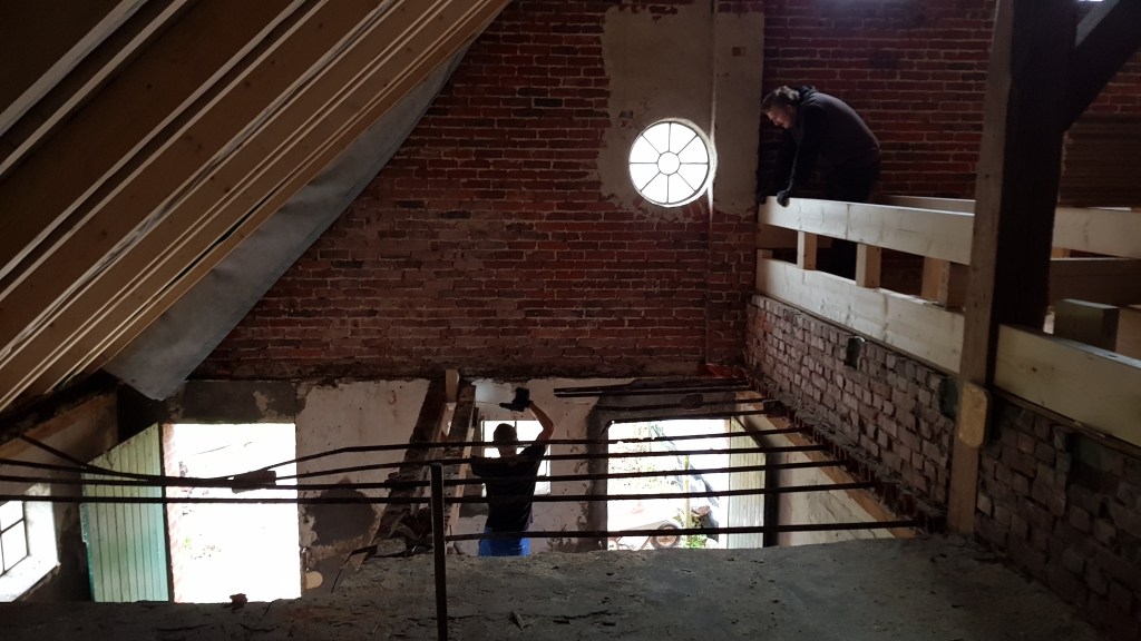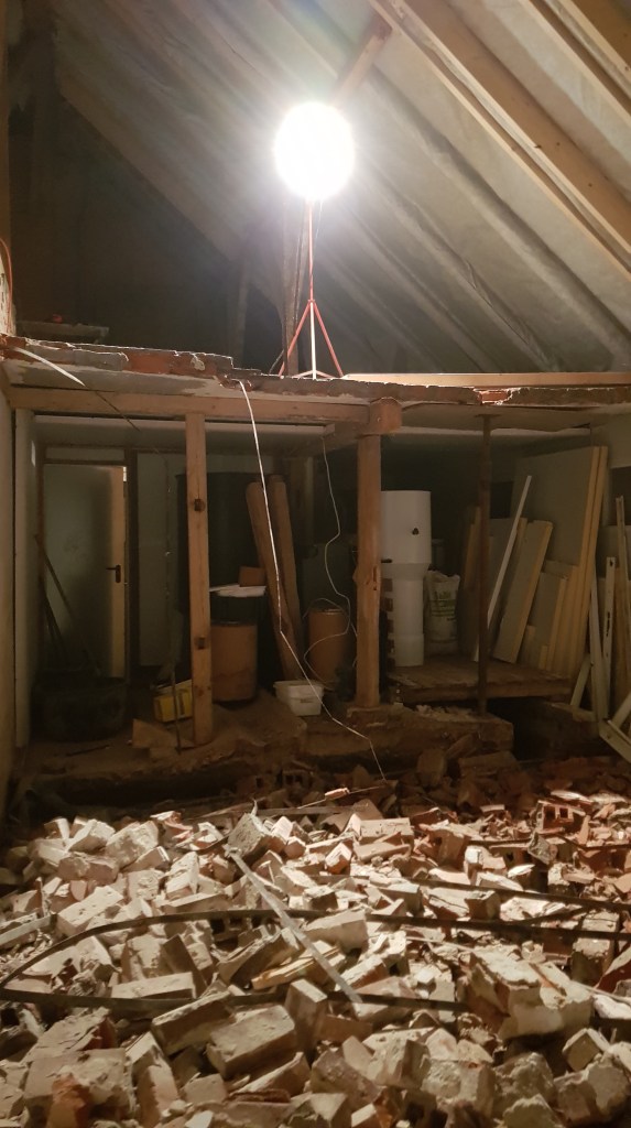 Da wir vom Eingangsbereich nach oben eine Treppe benötigen, schlug Schwengels unser Bauunternehmer vor, die ganze Decke rauszunehmen und zu erneuern. Die wankte auch schon gut beim rüber laufen und wirkte nicht sehr vertrauenerweckend. Mit dabei waren wieder Freunde von uns und Jans Vater.