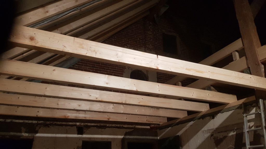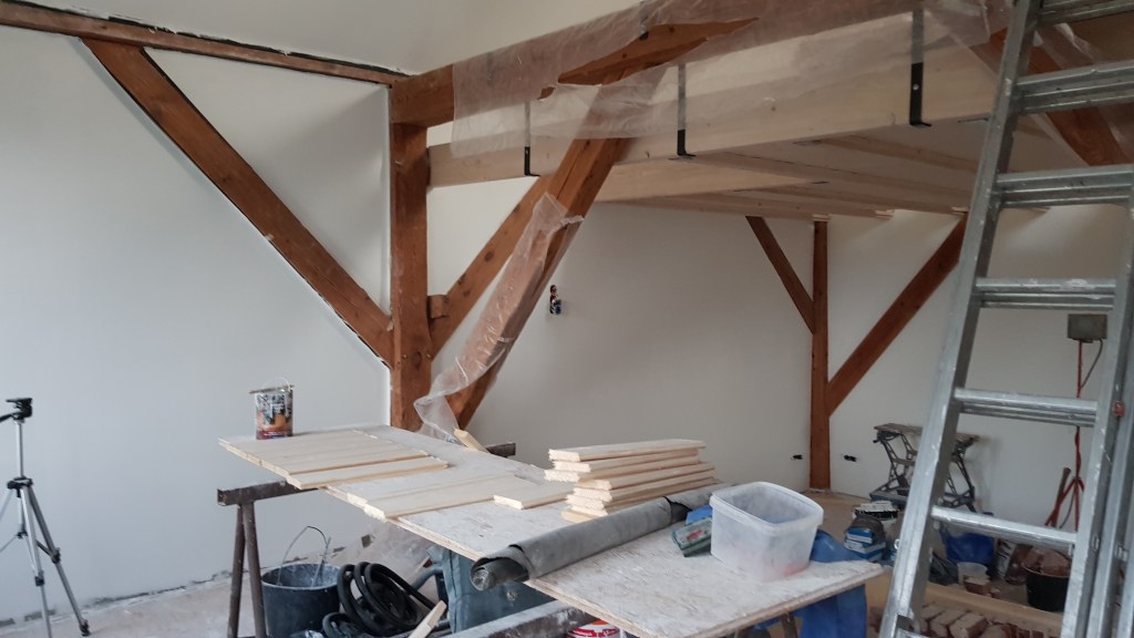 Die Querbalken kommen rein. Unsere Zukünftige Decke im Eingangsbereich (Partyraum).