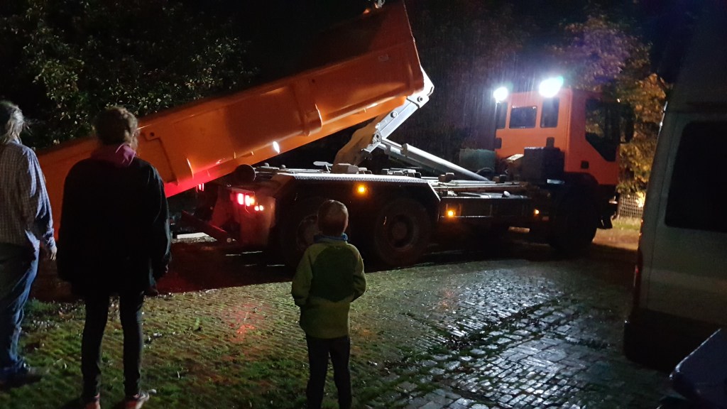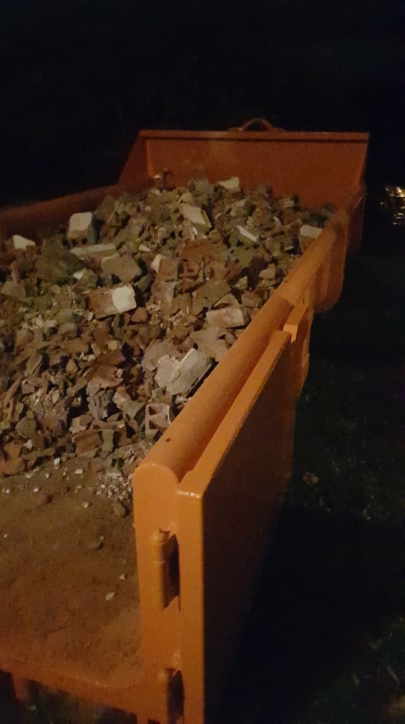 Die Decke ist raus und der Container ist unterwegs. Da kommt der Schutt von der Decke/Boden wieder hinein.