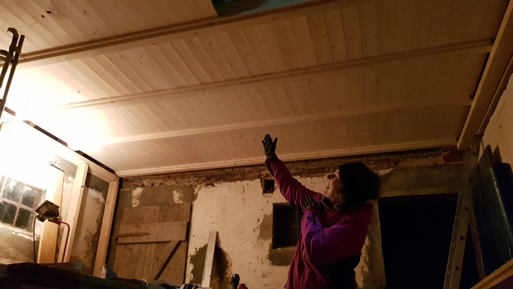 Leisten an den Balken befestigt, Latten angemalt, gesägt und verlegt. Die Decke ist fertig. Zumindest von unten.