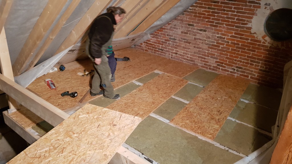 Steinwolle rein und OSB Platten wieder drauf! Die Decke des Eingangsbereiches wird unser Schlafzimmer.