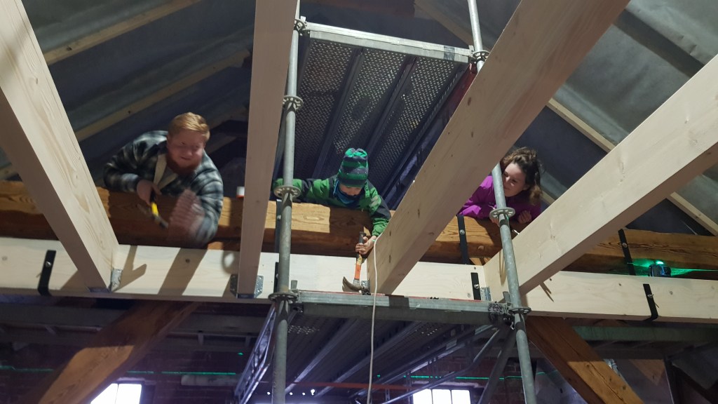 Mattes, Finn und ich (Kati) schlagen die Nägel in die Balken durch die Balkenschuhe unserer Wohnzimmerdecke.