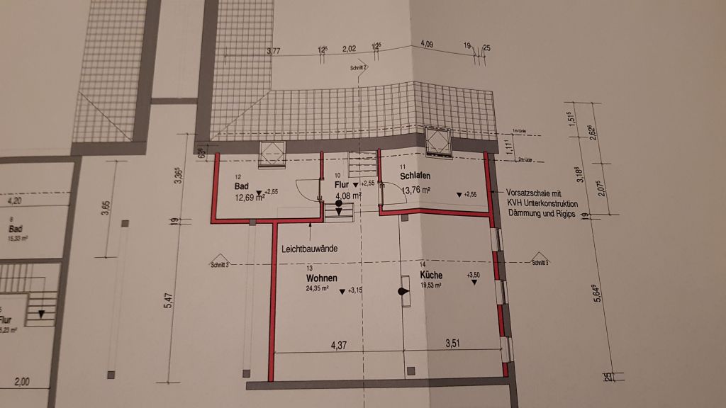 Auf gleicher Ebene wird wie das Wohnzimmer soll ebenso das Bad mit offener Dusche entstehen. Im Bad, Treppenaufgang und Schlafzimmer sollen Dachfenster eingesetzt werden. Zum Schlafzimmer wird es ein paar Stufen hinuntergehen, dadurch können wir in der dachschräge zusätzlichen Raum gewinnen.