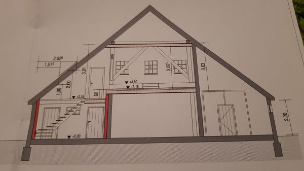 Im Obergeschoss wird es dann ein offenes Wohnzimmer mit Küche geben. In der Küche werden drei große Fenster sein, dafür werden die originalen Fensteröffnungen dann etwas verlängert. Der Fußboden der Küche wird dafür etwas höher als im Wohnzimmer sein, sodass eine Stufe die beiden Bereiche voneinander trennt. Im Wohnbereich soll die Möglichkeit bestehen einen Ofen anzuschließen.