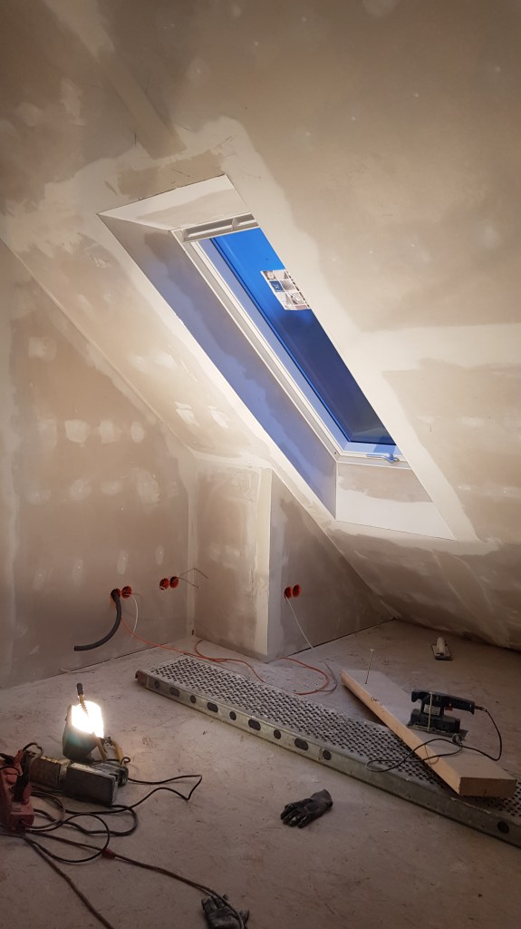 Im Wohnzimmer soll es noch eine kleine Treppe zum Raum unter dem Dach geben. Hier entsteht ein Büro, wo wir neue Projekte planen können. Auch hier kommen Dachfenster rein, damit wir den Ausblick genießen können. Der Raum wird zur Küche hin offen bleiben, sodass man in die Küche hinunter gucken kann, denn die Decke der Küche bleibt bis in den Giebel offen und hat damit eine maximale Raumhöhe von 4,5 Metern.